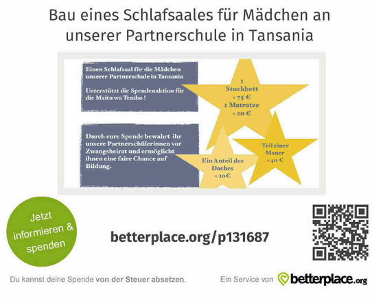 ![]() ![]() Hier mit einem Klick Geld für einen neuen Schlafsaal für Mädchen an der Msitu spenden! |